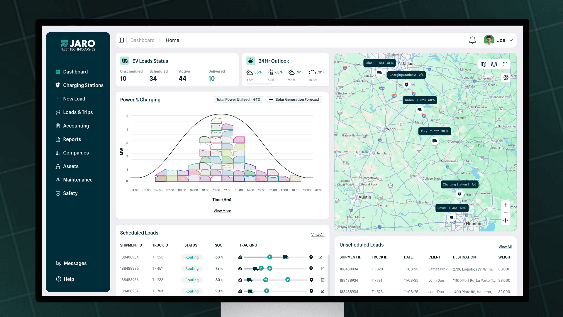 Visual Monitoring & Charts — fleet-level charts for active trips, charging sessions, and truck availability for immediate situational awareness.