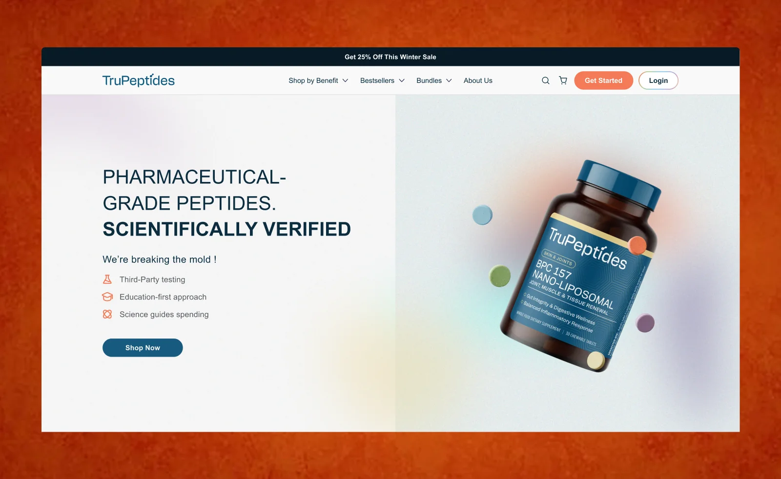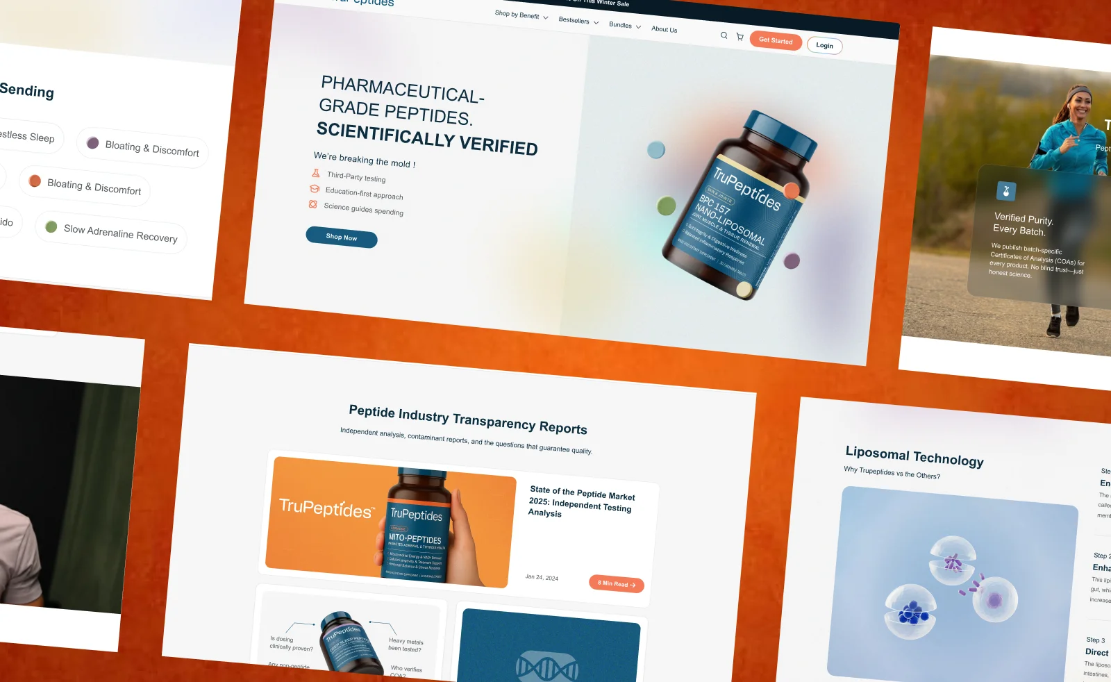 As a new startup, TruPeptide lacked a strong visual presence and clear product communication. The website needed to establish trust quickly, explain complex peptide benefits in a simple way, and look credible in a highly competitive supplement market. Product imagery was missing, and the overall experience did not yet reflect a premium, science-driven brand.